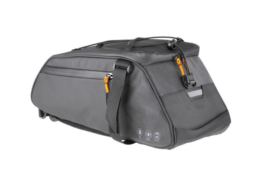 Сумка легко крепится с помощью 4 велкро-ремешков на багажник или быстро снимается и используется как рюкзак.