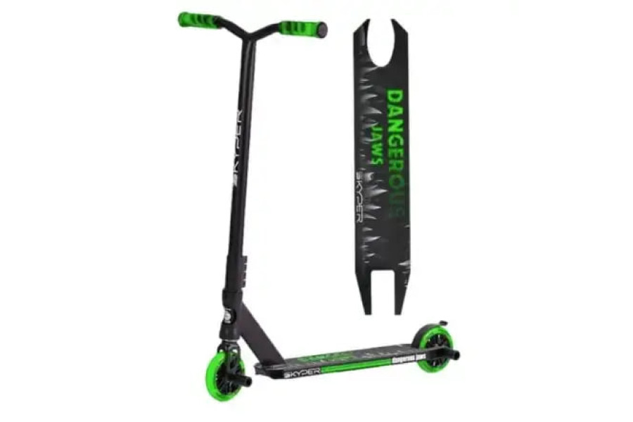 Дека и трюковые возможности: Компактная дека 50 × 10 см с агрессивным антискользящим покрытием дополнена двумя стальными пегами (5,4 см), что позволяет выполнять сложные гринды и слайды сразу «из коробки».