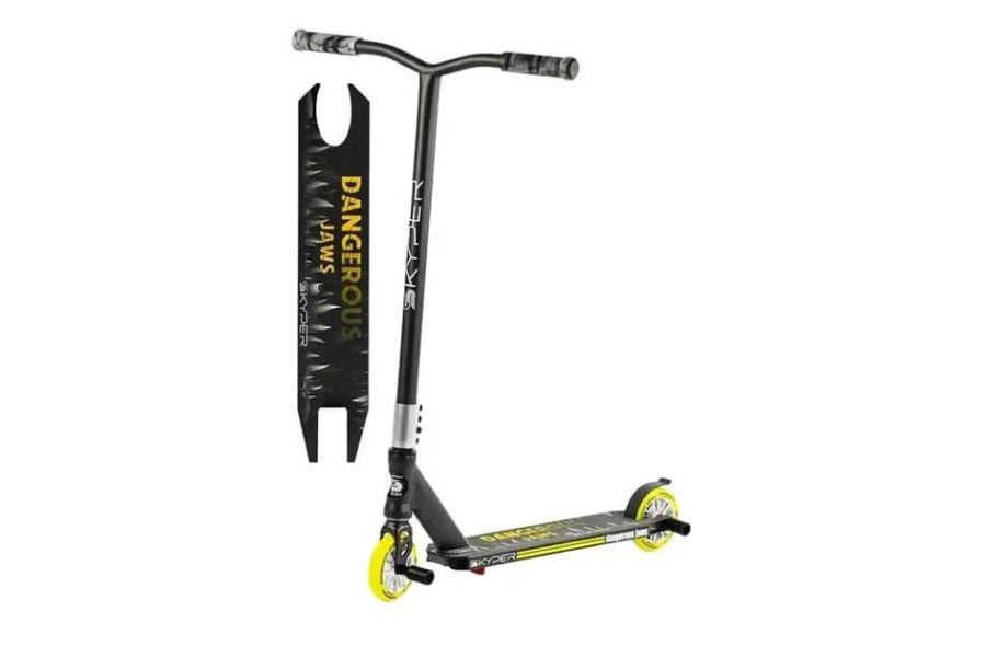 Дека и трюковые возможности: Компактная дека 50 × 10 см с агрессивным антискользящим покрытием дополнена двумя стальными пегами (5,4 см), что позволяет выполнять сложные гринды и слайды сразу «из коробки».