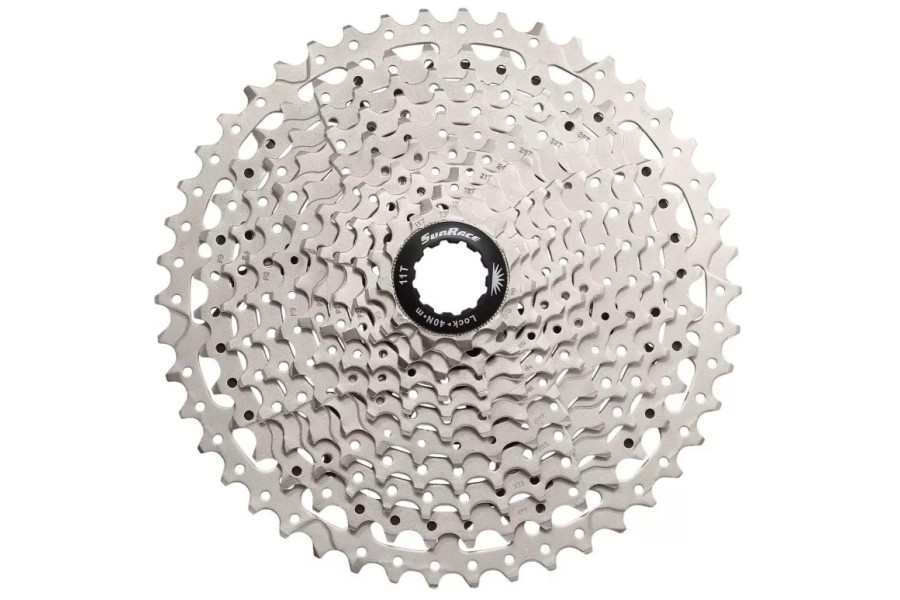 Кассета 11-шв. 11-46T SUN RACE MS8 MTB - касета високого рівня від компанії SUN RACE має полегшену конструкцію і збільшені зірки, для більшої прохідності велосипеда і можливості заїжджати на крутіші пагорби. Підходить для використання з гірською та гравійною трансмісією на х11 передач. Конструкція з високоміцної сталі забезпечує надійну і довгу експлуатацію. Виконана із застосуванням поліпшеної технології Fluid Drive Plus, яка забезпечує їй відмінну роботу в сухих і вологих умовах при будь-яких навантаженнях. Основа касети має форму павука, завдяки чому менше втрачається потужність педалювання, зменшується вага, а барабан втулки менше зношується. Зірки сумісні з будь-якими ланцюгами на 11 швидкостей. Високоякісне порошкове покриття Metallic Silver захищає від корозії, подовжуючи касеті термін служби.