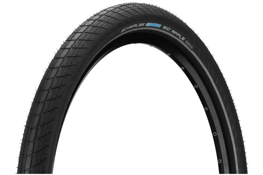 Покришка Schwalbe 20x2.0 Big Apple – міська шина від виробника Schwalbe, встановлюється на дитячі чи дорослі велосипеди з розміром коліс 20 дюймів. Покришка виготовлена з антипрокольним шаром і світловідбивною смугою.