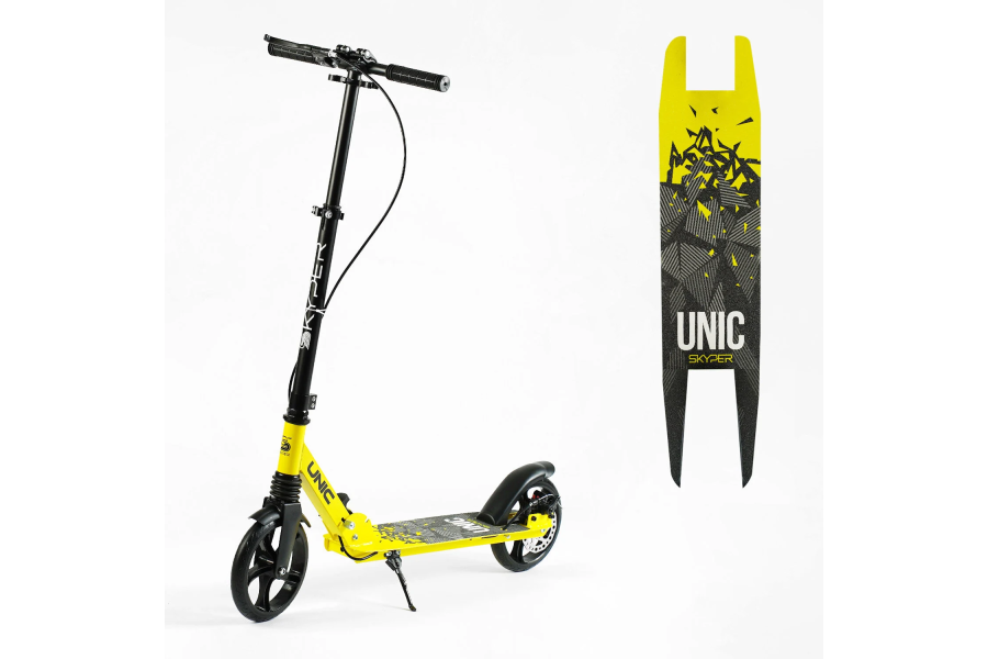 Самокат Skyper Unic - надійний, прогулянковий самокат на 20-сантиметрових колесах. Рама самоката виготовлена з міцної сталі, яка стійка до навантажень. Висоту керма можна відрегулювати під зріст дитини.