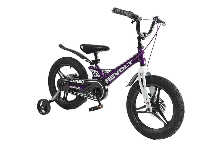 Велосипед Corso Revolt 16 — отличный и стильный велосипед для вашего ребёнка. Благодаря магниевой раме, магниевым дискам и магниевой вилке он имеет очень лёгкий вес по сравнению с велосипедами на стальной раме — разница составляет примерно от 3 до 4 килограммов в зависимости от модели велосипеда.